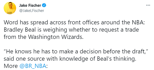 JRS直播网讯 据NBA记者JakeFischer报道,奇才后卫布拉德利-比尔正在考虑在选秀大会前提出交易申请,若比尔最终决定申请离队,凯尔特人、勇士、热火、猛龙、独行侠和费城都将加入比尔争夺战。