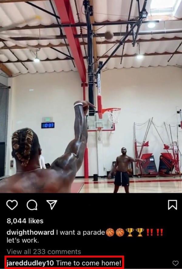 JRS直播网讯 北京时间7月25日,“魔术”霍华德在INS上晒出自己训练三分的画面,训练中三分全中,并声称:我想要一个冠军游行!让我们开始工作;对此湖人老将杜德利公开招募:是时候回家了。