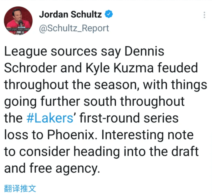 记者Jordan Schultz爆料,库兹马整个赛季与施罗德都处于不和的状态中,在球队首轮输给太阳的比赛中,他们的关系进一步恶化。这两个消息一爆料,立刻引发了全网热议,消息不可能是空穴来风,就像利拉德要申请离队的消息一样,尽管他重申自己没主动提交易,但对球队的不满是确实存在的,相信库兹马在湖人内部一定有些问题存在!
