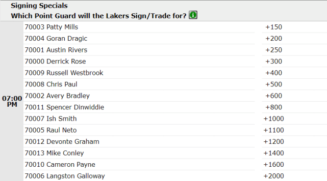 JRS直播网讯 北京时间7月24日,湖人的休赛期目标之一,就是引进一位有经验的控卫,无论是通过签约还是交易的方式。如今,湖人控卫引援赔率也正式出炉。赔率榜上,高居首位的是马刺后卫帕蒂-米尔斯,罗斯、威少、保罗、丁威迪的名字也都在列。