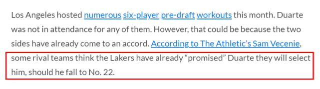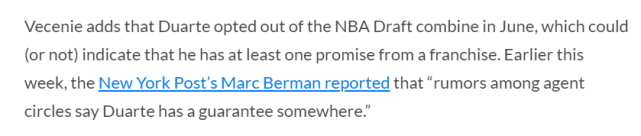 Vecenie指出,杜阿尔特退出了6月份的联合试训,表明他可能得到了至少一支NBA球队的承诺,另据名记Marc Berman的报道,经纪人圈内也传言杜阿尔特得到一支球队承诺的消息。