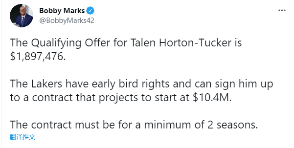 湖人资质报价是190万美元,湖人拥有塔克的鸟权,合同有效期至少2年。