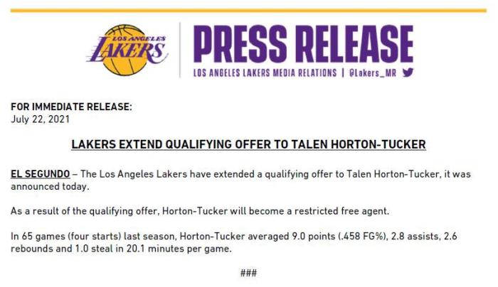 JRS直播网讯 北京时间7月23日,据名记shams报道,湖人已经给霍顿-塔克提供了资质报价,从而让塔克成为一名受限制的自由球;之后湖人正式官宣这一决定,有权匹配任何报价,可签2年1900万。