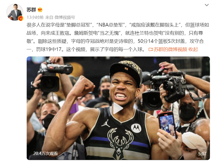 因为此前伤了欧文,一直有人说字母哥打球脏,后来抨击他这个冠军很水!但国内几大名嘴都认为这不叫事,王仕鹏在解说中表示“人们不会记得你垫脚,只会记得总冠军”苏群也在社媒上表示“篮球场如战场,向来成王败寇。”况且詹姆斯、杜兰特等人也发来了贺电,冠军就是冠军,没必要谈其他的。
