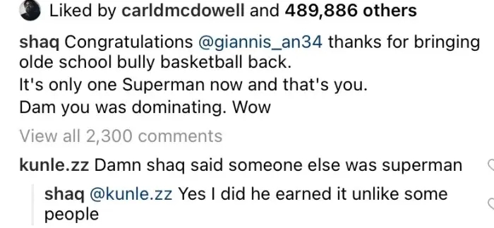昨日雄鹿夺冠后奥尼尔更新社媒祝贺“祝贺你字母哥,感谢你带回了老派粗犷的内线比赛风格。现在只有一个超人那就是你。你TM真是太有统治力了。”今日则有网友评论“奥尼尔是在说曾经还有人是超人吗?”奥尼尔本人回复“是的没错,不过字母哥的超人称号是他赢来的,不像某些人。”