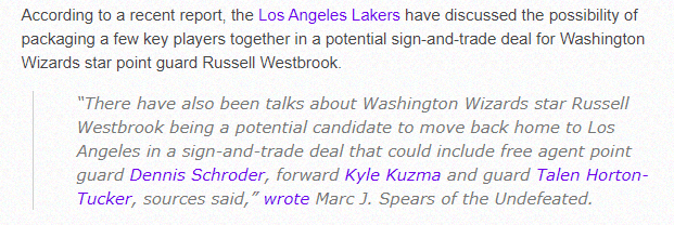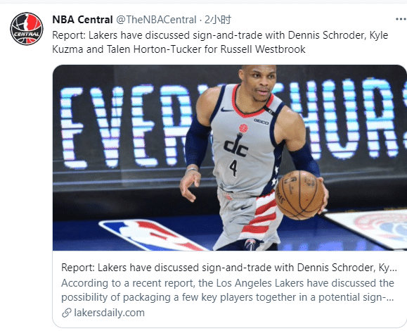 JRS直播网讯 北京时间7月22日,湖人两大引援目标曝光,威少和保罗都在名单上,据名记Marc J Spears报道,湖人有兴趣交易得到威少,他们能提供的筹码是库兹马、塔克以及施罗德,其中施罗德需要湖人进行先签后换的操作;3换1引援威少吗?今年休赛期,湖人有意引援威少,打造詹姆斯+浓眉+威少的三巨头组合。