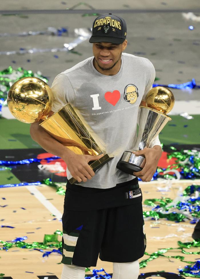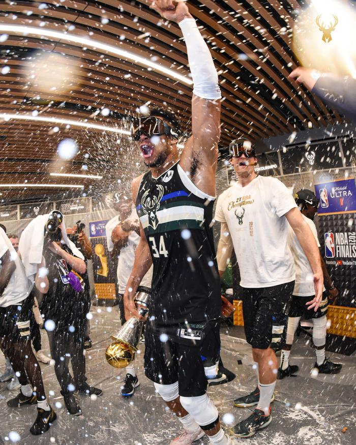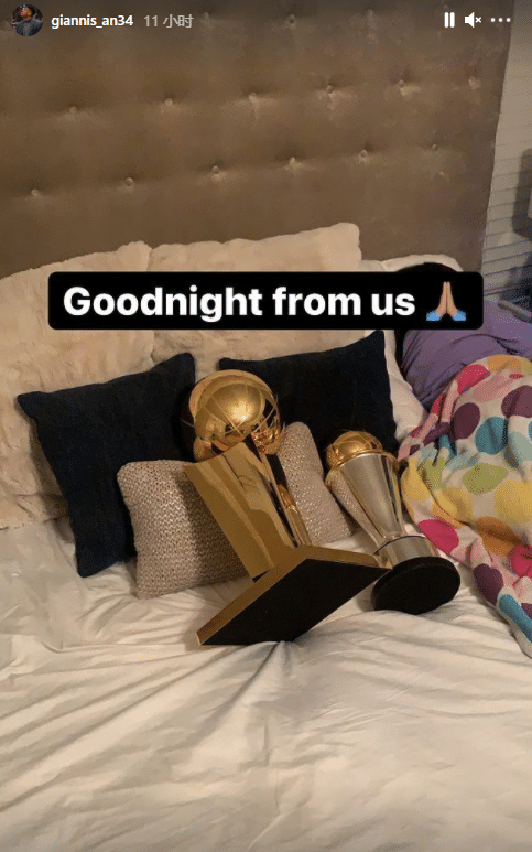 JRS直播网讯 密尔沃基雄鹿4-2击败太阳夺得总冠军之后,字母哥第一个把总冠军奖杯带回家,并且抱着奥布莱恩杯和FMVP奖杯睡觉;总决赛G6字母哥狂砍50分14篮板5盖帽,总决赛场均35+13全票当选FMVP。