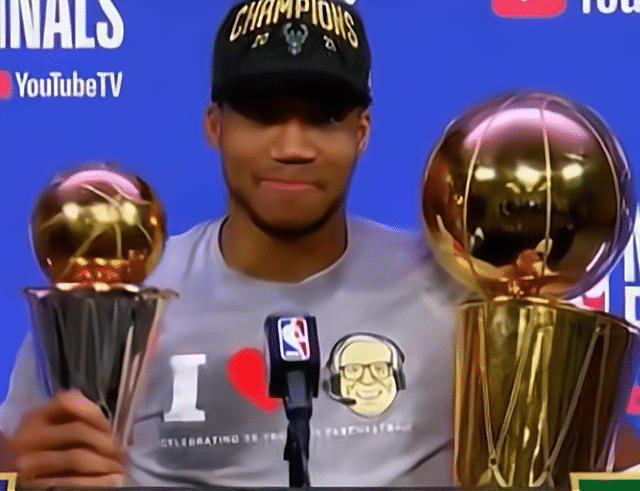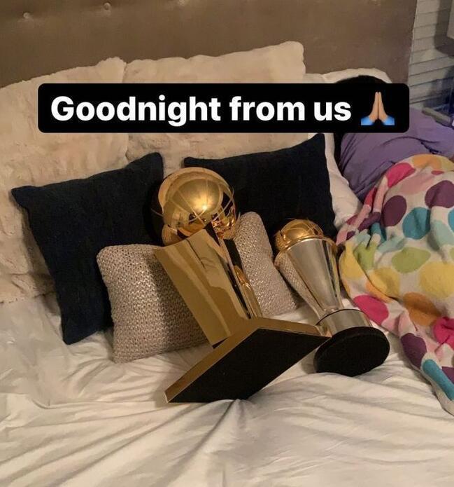 字母哥带着总冠军奖杯和FMVP奖杯来到了炸鸡店,他给自己点了50块鸡块,期间还让球迷摸了一下总冠军奖杯。夺冠后,第一时间带着奖杯到处跑,整个NBA除了字母哥也没谁这样干了。在结束了一天的庆祝,字母哥把两个奖杯放到了场上,看来今天晚上字母哥的老婆要去打地铺。