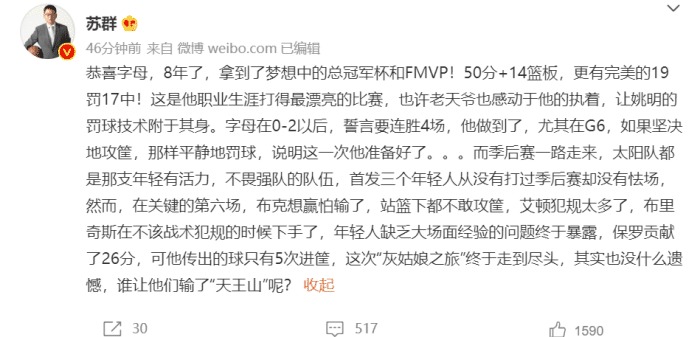 苏群和王猛也纷纷在社媒上发声心疼36岁的保罗,竞技体育就是这么残酷,他错过的可能是生涯最好的一次夺冠机会,即使以后再有机会他可能也不算是核心球员了,若是能以角色球员的身份夺冠也还行,但前提是放弃一部分薪水!