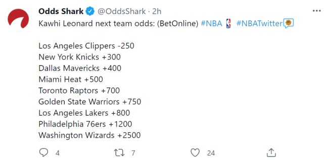 JRS直播网讯 北京时间7月21日,科怀-莱昂纳德已经完成前十字韧带的修复手术,预计要缺席2021-22赛季的大部分时间。此前有报道称,他依然会跳出合同,成为一名自由球员,那么莱昂纳德接下来会和哪支球队签约呢?最新下家赔率已经出炉!