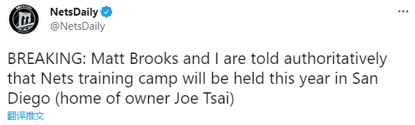 根据此前美媒NetsDaily报道,篮网新赛季训练营将于9月29日在圣地亚哥举办,而蔡崇信的家就在圣地亚哥;篮网全队集训之后,将于10月4日季前赛首战湖人。