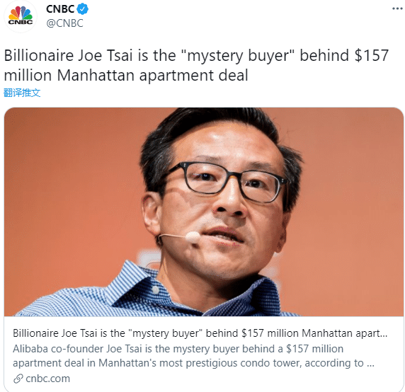 2019年,蔡崇信斥资35亿美元买下篮网队和巴克莱中心球馆,成为篮网队新老板;如今蔡老板又在纽约买下两层公寓,位于曼哈顿中央公园南220号,总共花费1.57亿美元;这是美国有史以来第三贵的房子。美国有史以来最贵的房产交易也在这同一栋楼里——肯-格里芬在2019年以2.38亿美元购买了四层。