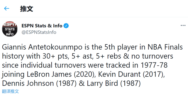 据ESPN统计,字母哥是总决赛历史第5位单场砍下30+5+5且0失误的球员,比肩詹姆斯、杜兰特、丹尼斯约翰逊以及拉里伯德。