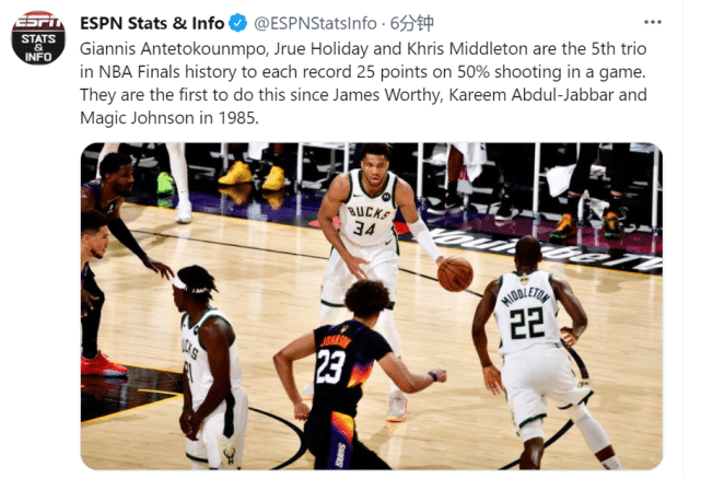 这场比赛,雄鹿三大核心全部发挥,字母哥23中14罚球11中4砍下32分9板6助攻并且没有出现失误!米德尔顿23中12砍下29分7板5助攻,而霍乐迪则是20中12贡献27分4板13助攻3抢断1盖帽填满数据栏!据ESPN统计,雄鹿三巨头是历史第5个在总决赛均以至少50%命中率砍下25+的三人组,上一次是1985年湖人三巨头贾巴尔、魔术师约翰逊、詹姆斯沃西。