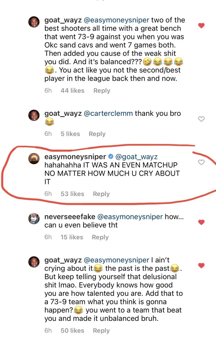 之前接受采访时他曾说在美国队训练期间,基本上不出房间,也没太多时间看总决赛比赛,但他还是有时间玩社媒的!一位网友发布帖子写道:“雄鹿和太阳在为我们奉献自从2016年以来最好的NBA总决赛……我只是希望我们能打到抢七”杜兰特立刻回复称17年的骑士勇士大战比这个好看!