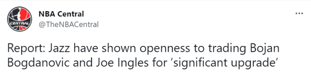 JRS直播网讯 北京时间7月19日,据NBA记者Matt Moore报道,消息源透露,如果爵士能通过交易获得重大升级,他们愿意送出博格达诺维奇和英格尔斯。爵士下赛季的阵容预计会有一些变动,康利也将在休赛期成为不受限制的自由球员。