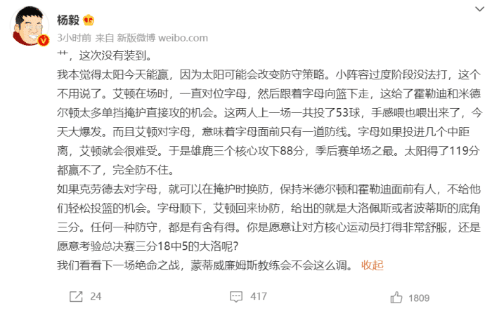 杨毅在赛后社媒的发言,似乎也有种看衰太阳的意思,认为他们能做的调整不多了!还有个问题就是艾顿防字母哥的话,太阳对于霍勒迪和米德尔顿的挡拆就难以防范了,也都看到了他们两人本场的投篮手感,被放掉也是非常可怕,任何一种防守只能侧重一方面,就看太阳是打算死守禁区盯防字母哥,或是选择其他方式了!