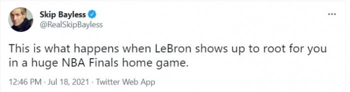 有趣的是,赛后终于看到“衣食父母”老詹出现在现场观战的评论员Skip Bayless在推特上发推说道:“看到了吗太阳队,这就是勒布朗总决赛来到主场给你加油的下场。”老詹赛前就表示自己是来给保罗加油的,但没想到没给好兄弟带来好运,还成为了字母哥隔扣保罗的背景板之一!