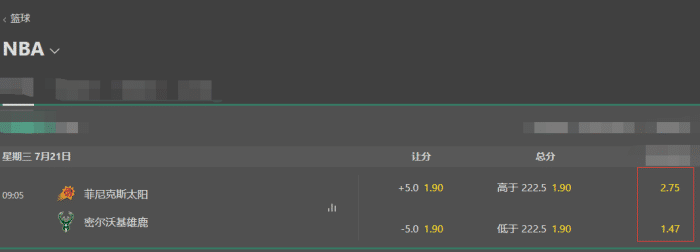 数据显示,雄鹿最新的夺冠赔率数字已经来到了疯狂1:1.23,而太阳则是1:4.25。这是一个相当悬殊的差距,相当于投入100,如果雄鹿拿到总冠军,你只能收到23的奖励;如果太阳最终拿到总冠军,你能收获325的奖励。毫无疑问,太阳拿到总冠军已经是小概率事件。