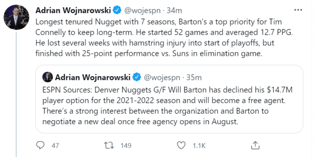 JRS直播网讯 北京时间7月18日,据ESPN报道,掘金后卫威尔-巴顿已经拒绝执行下赛季1470万美元的球员选项,他将成为一名完全自由球员。名记沃纳罗斯基表示,巴顿和掘金都有兴趣在休赛期达成一项新的合同。掘金随队记者表示,球队有信心将巴顿继续留在丹佛。