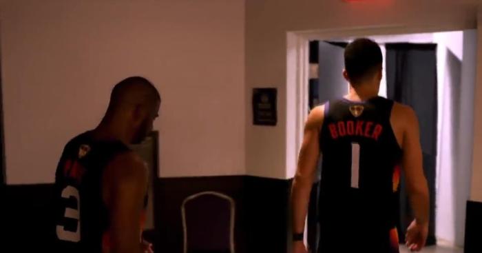 来到最后的13秒,布克强突急停后,转身后将球暴露在霍乐迪的面前,霍乐迪的抢断明显是摁在布克的胳膊上,然后再触碰到球完成抢断,可是裁判依旧没有任何表示,这接连的争议判罚,也让太阳队两个核心在比赛结束后,第一时间头也不回的选择了退场,表示抗议。