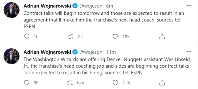 JRS直播网讯北京时间7月17日,据名记沃纳罗斯基报道,奇才已经敲定了新任主教练的人选,掘金助教小昂塞尔德最终胜出,双方将在明日开始讨论合同细节。新赛季,小昂塞尔德将执教威少和比尔,奇才本赛季34胜38负,季后赛首轮1-4被费城淘汰,布鲁克斯下课。