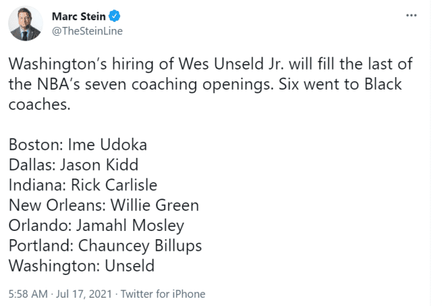 随着奇才确定聘用小昂塞尔德担任新主帅,联盟本赛季七支球队的换帅结果已经全部出炉。凯尔特人的新帅是乌多卡,独行侠的新帅是基德,步行者的新帅是卡莱尔,鹈鹕的新帅是威利-格林,魔术的新帅是莫斯利,开拓者的新帅是比卢普斯,奇才的新帅是小昂塞尔德。名记马克-斯坦恩列出了7位新帅后,指出其中6位是黑人教练。