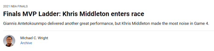 JRS直播网讯 官方FMVP榜更新,经历了总决赛G4一战,雄鹿已经把系列赛比分改写为2-2平局,回到一个起跑线,太阳夺冠的概率可能变低了,这一点从最新一期的FMVP榜就能履略知一二,因为米德尔顿飙升至第二,保罗低迷跌出前5,字母哥登顶,FMVP再也不是保罗和布克队内竞争的悬念,因为FMVP榜第一和第二分别被字母哥和米德尔顿占据。