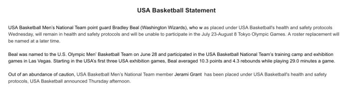 JRS直播网讯 北京时间7月16日,奇才球星布拉德利-比尔因触发安全与健康协议被隔离,并且确定无缘东京奥运会,之后美国男篮将宣布比尔的替代人选;实际上,比尔的检测结果呈阳性,阿德巴约透露了这一结果。