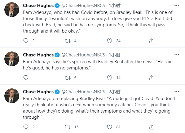 谈到比尔的替代者,阿德巴约说道:这有个哥们刚感染了新冠。当有人确诊时,你不会去想他的替代者是谁。你应该去担心他是否有症状,以及他正在经历的困难。