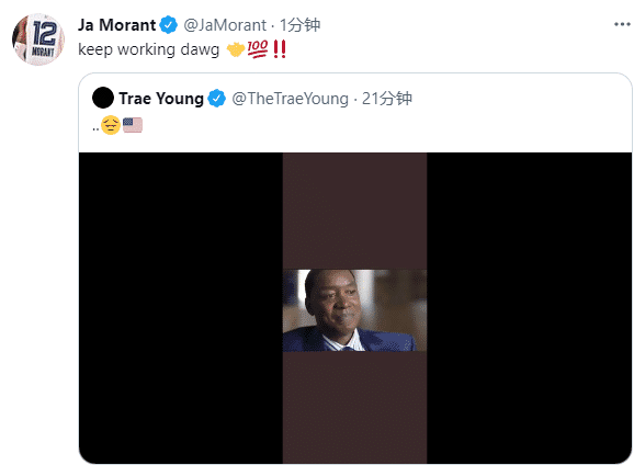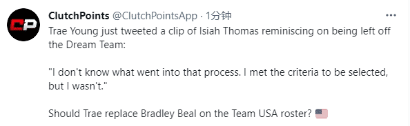 特雷-杨晒出一段当年“微笑刺客”以赛亚-托马斯不满落选梦之队的视频,微笑刺客在视频中表示:我不知道这个过程是怎么回事。我符合入选梦之队的标准,但我落选了;特雷-杨晒视频回应落选梦之队,发推晒出思考表情;莫兰特回复:兄弟,继续训练吧!