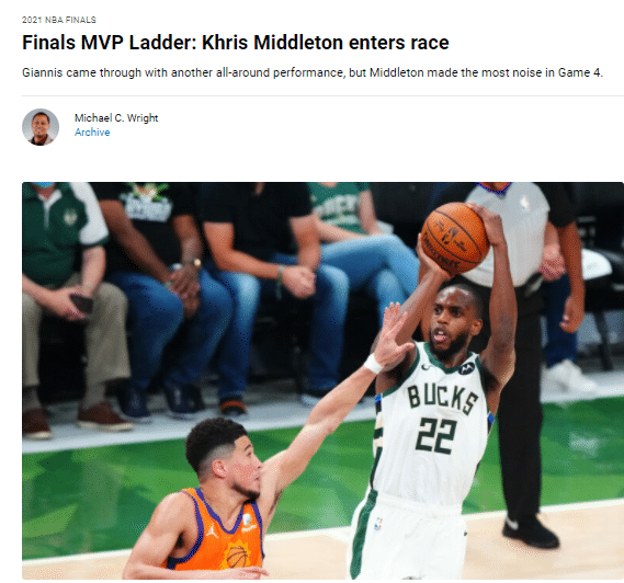 米德尔顿总决赛场均贡献24.5分6.5篮板5.5助攻1.3抢断;G4一战证明自己,米神不仅全场轰下40分6篮板4助攻2抢断,而且末节最后2分15秒独砍10分带领雄鹿把系列赛拖进天王山;凭借G4的疯狂表现,米德尔顿已经成为FMVP第二热门候选人。