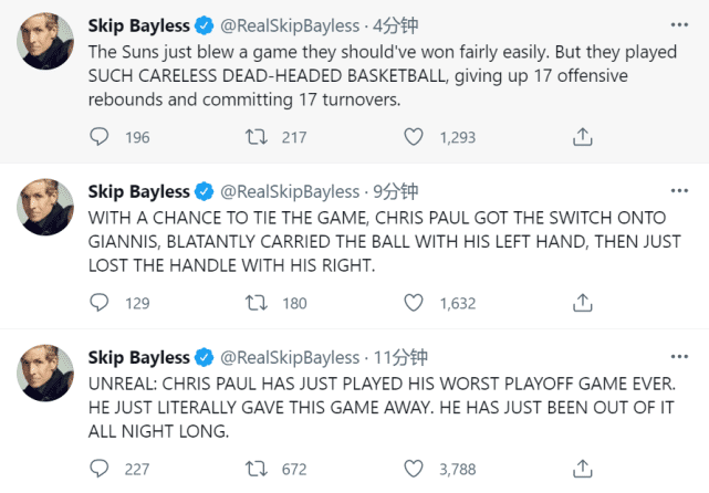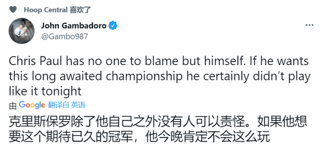 保罗糟糕的表现也引发了美媒的讨论,几乎全是批评的声音,赛后评论员Skip Bayless连续发推点评了本场保罗的表现,Skip说:“保罗本场打出了他有史以来最差的一场季后赛,他把本场胜利拱手相让给了对方,他一整晚都昏昏沉沉的。”名嘴sharpe直言:“今晚比赛保罗的表现太糟糕了。”而美记Gambodoro则质疑保罗:“他真的想夺冠吗?如果保罗对总冠军已经期待已久,那么他就不该有今晚这样的表现。”