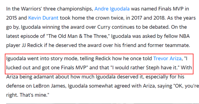 如今,伊戈达拉也正面回答了这个问题。伊戈达拉回忆起一段往事,自己曾经告诉阿里扎:“我很幸运,得到了一个总决赛MVP”,“我宁愿斯蒂芬拥有它”。不过阿里扎坚持认为伊戈达拉应得的,尤其是他对勒布朗詹姆斯的防守。伊戈达拉有点同意阿里扎的观点,他说:“好吧,你说得对。那是我的。”