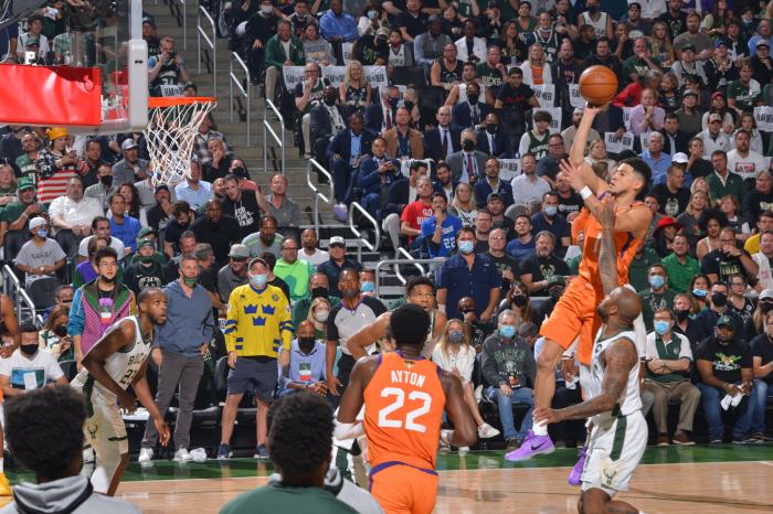 比赛正式开打,布克开场便连得4分,太阳10-4打停雄鹿,不过之后布克手感有所下滑,首节7投3中拿到8分,三记中投和两罚全中;第二节,布克防守端被霍勒迪肘击到鼻子,之后他坐回替补席;当雄鹿反超比分时,布克上场独挑进攻大旗,连续投进高难度中投,漂移后仰跳投太像科比,单节8中5独砍12分火力全开。