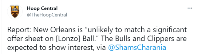 斯坦恩报道称,23岁的球哥在休赛期将成为受限制的自由球员,这意味着鹈鹕可以匹配球哥收到的任何报价,但最近的消息表明,鹈鹕不大可能匹配太高的价格。