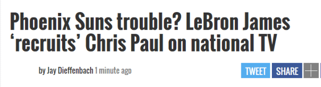JRS直播网7月14日讯 湖人球星勒布朗-詹姆斯参加了《吉米鸡毛秀》,引起球迷热议。在节目中,主持人询问了詹姆斯是否期待和保罗联手的话题,而詹姆斯连用三个“绝对的”表明了自己的心意。美媒的标题是:太阳的麻烦来了?勒布朗-詹姆斯在国家电视台“招募”克里斯-保罗。