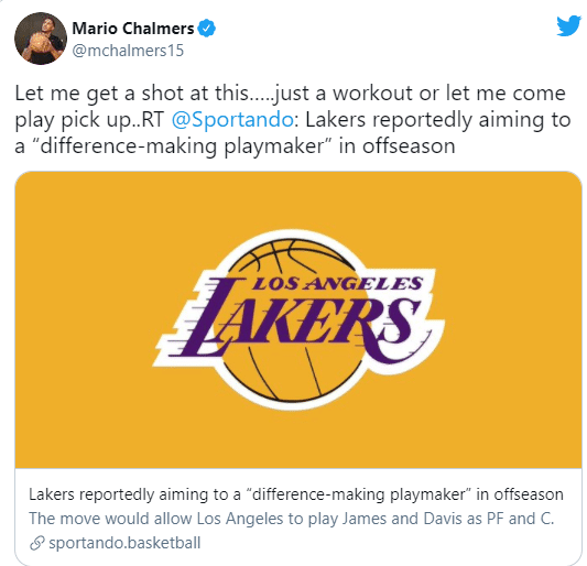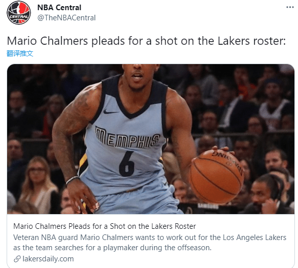 JRS直播网7月14日讯 ,湖人想引援控卫,结果詹姆斯昔日队友查尔莫斯毛遂自荐,恳求加盟湖人,他发推写道:让我试试吧,无论是试训还是让我过去打一场比赛都行。