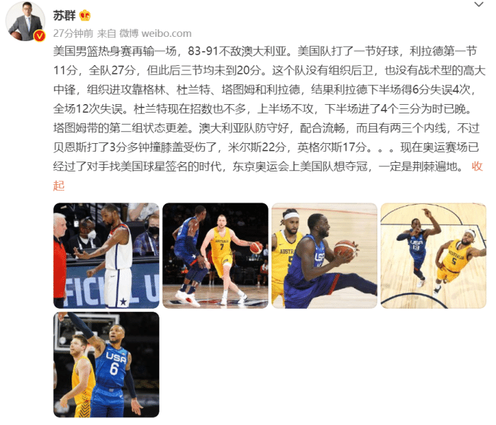 苏群也说“现在奥运赛场已经过了对手找美国球星签名的时代,东京奥运会上美国队想夺冠,一定是荆棘遍地。”曾经的梦之队大牌云集,很多对手都会在赛后跟他们合影要签名,但现在美国队没有那种场均赢30分的实力,也没人再把你当明星,既然热身赛能击败你,正赛当然也有赢你的信心,美国队要小心了!