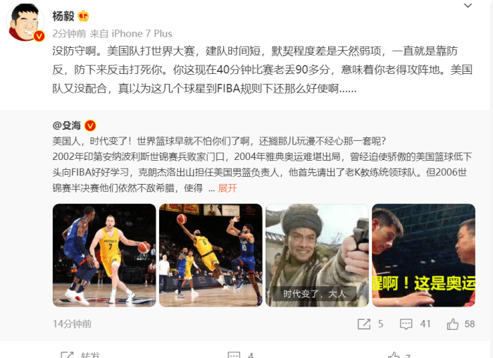 谈到这场比赛国内的几大名嘴也给出了自己的观点,宝岛名嘴朱彦硕跟我说的差不多,磨合时间短没时间集训,只能以赛代练!杨毅强调这支美国队没有防守,没法打最擅长的攻守转换,40分钟的比赛丢90多分,自己守不住没法打快攻,落入阵地又没有配合,这样打到国际赛场不好使!