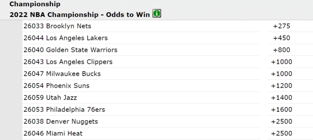 JRS直播网讯 2021年的总冠军还未正式产生,2022年的总冠军赔率已经出炉!本赛季止步东部半决赛的篮网,成为2021-22赛季总冠军的最大热门,而今年首轮就被淘汰的湖人,在下赛季冠军赔率排名中位居第二,是西部最被看好的球队。以下是具体排名和解析——