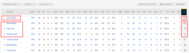 JRS直播网讯 季后赛至今,谁是太阳队内正负值最高的球员?保罗,布克还是艾顿?真正的答案是杰-克劳德!他的季后赛正负值达到+105,排名全队第一,比布克(+100)、保罗(+73)和艾顿(+73)都要高!