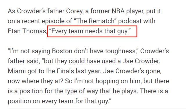 “我不是说波士顿失去了韧性,”克劳德的父亲说道,“但他们本可以继续留下杰-克劳德。迈阿密去年打进了总决赛,克劳德走了后,现在他们在哪里?我不是吹捧他,但他打球的方式确实为自己赢得了位置,每支球队都会为这样的球员留出位置。”2020年效力热火,2021年效力太阳,克劳德连续两个赛季打进总决赛。