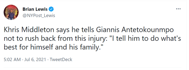 米德尔顿在采访环节中被问到字母哥的伤情,这位已经和字母哥共同效力多年的队友的回应是:“我告诉他做对自己和家庭最好的决定。”他希望字母哥不要因急于回归,而造成对身体的伤害。