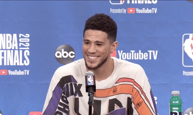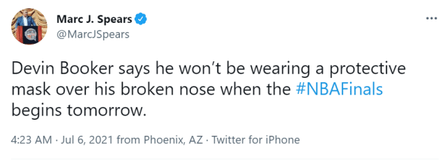 太阳一方,布克身穿1993年的太阳复古T恤接受采访,并在采访中正式宣布,自己在总决赛里将不再佩戴面具。此前,布克鼻子受伤,他不得不戴上面具。虽然他曾向“面具侠”汉密尔顿求教,但适应面具依然不是一件容易的事,他的表现也很不稳定。