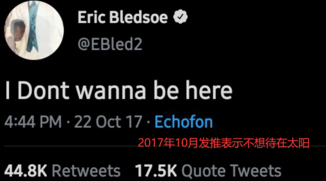 如今,太阳和雄鹿会师总决赛,而且至少一个前东家会夺冠,布莱德索难免心里不爽。但值得一提的是,当初布莱德索应该是主动要想离开菲尼克斯,因为在2017年10月,他曾发布了一条“我不想待在这里(太阳)”的推文。不到一个月后,布莱德索就被太阳交易到雄鹿。