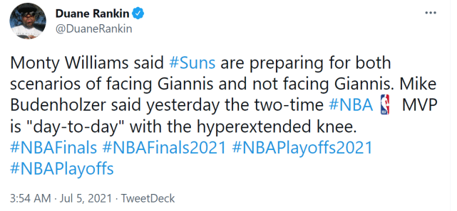 JRS直播网讯 雄鹿和太阳将在7月7日打响总决赛首战,而太阳主帅蒙蒂-威廉姆斯告诉记者,球队正在准备两套方案:一套是对阵拥有字母哥的雄鹿,而另一套是对阵没有字母哥的雄鹿。就在一天前,雄鹿主帅布登霍尔泽表示,字母哥目前的膝盖状态是每日观察,而外界普遍认为,字母哥有希望在第一场总决赛就回归。字母哥打不打还没最终敲定,蒙蒂计划做好两手准备。