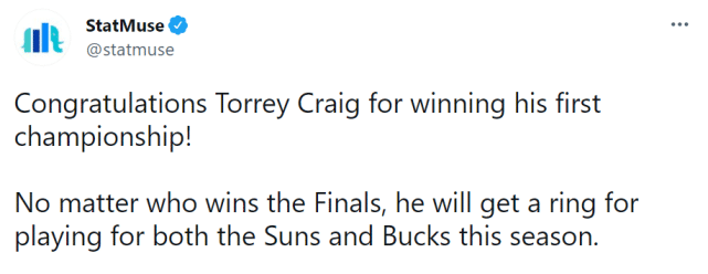 雄鹿晋级总决赛后,美媒第一时间调侃克莱格成为最大的赢家。目前效力太阳的克莱格,曾在本赛季为雄鹿打过球,按照NBA球队的惯例,他也算是雄鹿本赛季的一员。因此,无论最终太阳还是雄鹿夺冠,克莱格都能领到一枚总冠军戒指。当然,他肯定是更希望太阳赢下总决赛,那才是真正意义上的总冠军戒指。