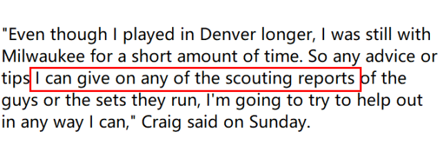 接受采访时,克莱格谈到了自己在总决赛“情报战”中的角色。“虽然我在丹佛效力的时间更久,但我也在雄鹿待了一小段时间,所以我可以为那些球员的球探报告给出一些建议和提示,我会尽己所能提供帮助。”克莱格说道。