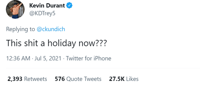 除了给把自己淘汰出局的字母哥点赞,7月5日,美国媒体晒图,5年前的今天,杜兰特宣布自己将走出舒适区,接受挑战去前勇士,可是在大多数球迷眼中,杜兰特似乎走进了一个更加舒适的包厢。